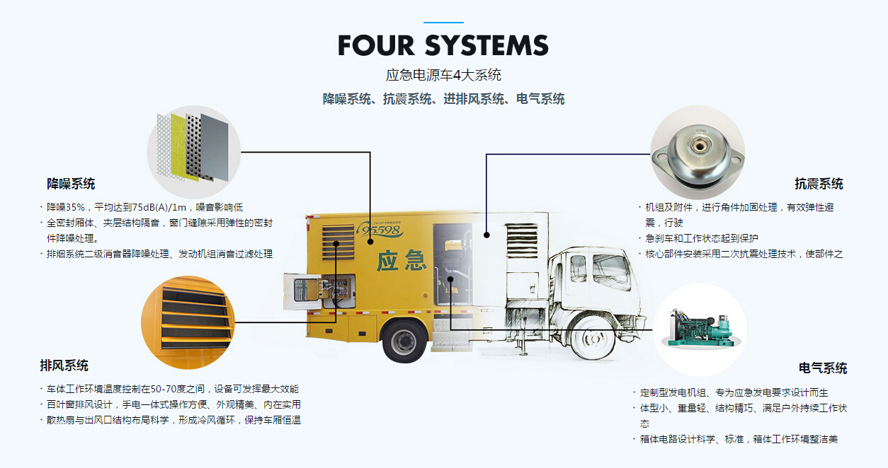 移動電源車由二類汽車底盤,靜音廂體,柴油發動機,發電機組,控制系統,內外照明裝置,輸配電裝置,電纜卷盤,電源輸入,輸出接口,液壓支腿等構成。